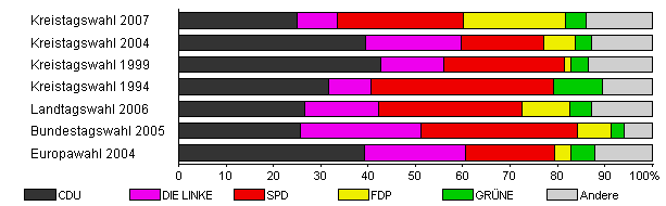 | Kreistagswahl 2007 | 36,8 | 25,1 | 8,5 | 26,6 | 21,6 | 4,2 | 13,9 | |
