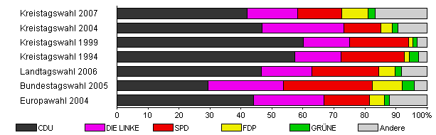 | Kreistagswahl 2007 | 33,0 | 42,0 | 16,4 | 14,1 | 8,6 | 2,2 | 16,8 | |