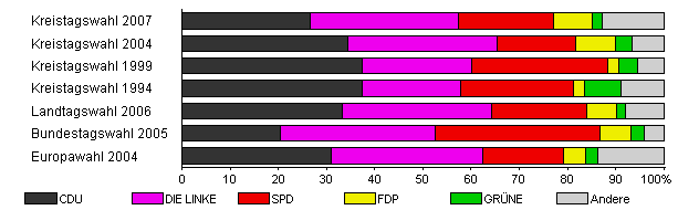 | Kreistagswahl 2007 | 29,1 | 26,6 | 30,9 | 19,6 | 8,0 | 2,2 | 12,8 | |