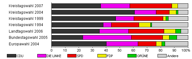 | Kreistagswahl 2007 | 41,4 | 36,1 | 21,4 | 30,7 | 4,2 | - | 7,7 | |