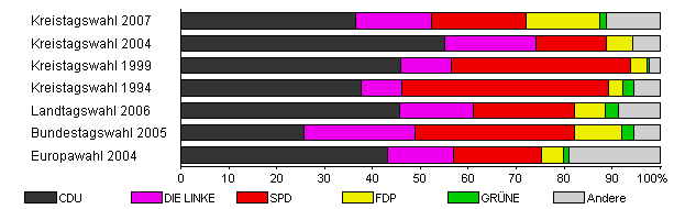 | Kreistagswahl 1999 | 63,2 | 45,8 | 10,7 | 37,4 | 3,4 | 0,6 | 2,1 | |