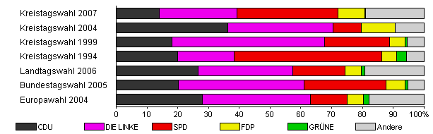 | Kreistagswahl 2007 | 44,9 | 14,0 | 25,2 | 32,8 | 8,9 | 0,2 | 19,0 | |