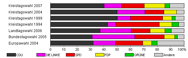 | Kreistagswahl 2007 | 44,2 | 40,2 | 13,1 | 16,9 | 15,5 | 3,5 | 10,8 | |