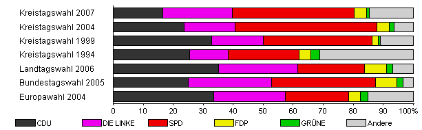 | Kreistagswahl 2004 | 50,9 | 23,6 | 17,0 | 47,3 | 4,2 | 1,5 | 6,4 | |