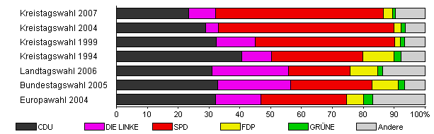 | Kreistagswahl 2007 | 47,6 | 23,3 | 8,8 | 54,5 | 2,9 | 1,0 | 9,3 | |