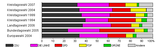 | Kreistagswahl 2007 | 33,7 | 31,9 | 28,8 | 14,7 | 10,4 | 1,7 | 12,6 | |