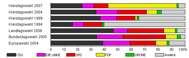 | Kreistagswahl 2007 | 49,4 | 23,5 | 8,7 | 10,5 | 51,2 | 1,1 | 5,0 | |