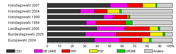 | Kreistagswahl 2007 | 42,8 | 50,2 | 13,8 | 12,3 | 10,4 | 1,1 | 12,1 | |