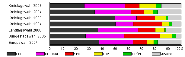 | Kreistagswahl 2007 | 31,4 | 26,5 | 30,9 | 10,8 | 12,8 | 4,0 | 15,0 | |