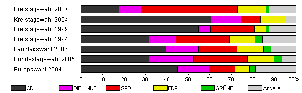 | Kreistagswahl 2007 | 45,5 | 17,6 | 10,3 | 45,1 | 13,0 | 1,6 | 12,4 | |