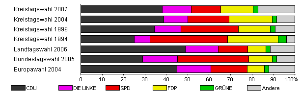 | Kreistagswahl 2007 | 37,9 | 38,2 | 13,4 | 13,9 | 15,0 | 2,3 | 17,1 | |
