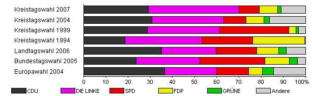 | Kreistagswahl 2007 | 23,0 | 29,2 | 40,7 | 9,2 | 8,4 | 1,6 | 10,9 | |