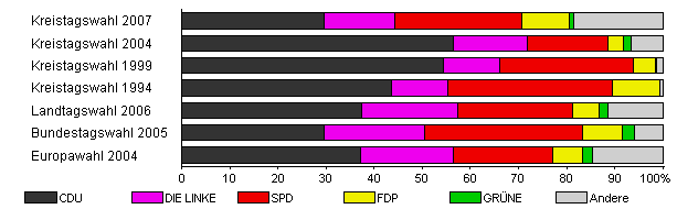 | Kreistagswahl 2007 | 34,9 | 29,6 | 14,7 | 26,3 | 10,0 | 0,8 | 18,7 | |