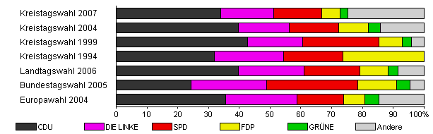 | Kreistagswahl 2007 | 33,6 | 33,9 | 17,2 | 15,7 | 5,9 | 2,6 | 24,7 | |