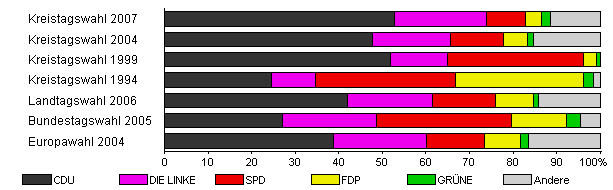 | Kreistagswahl 2007 | 27,1 | 52,7 | 21,3 | 8,8 | 3,8 | 2,0 | 11,5 | |