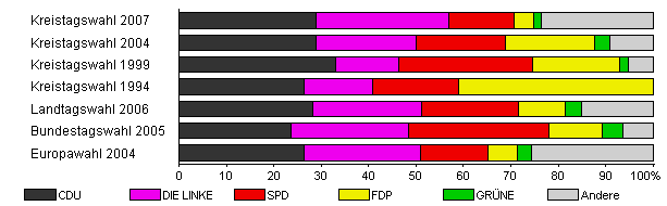 | Kreistagswahl 2007 | 35,7 | 29,0 | 27,9 | 13,7 | 4,3 | 1,6 | 23,6 | |