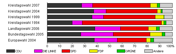 | Kreistagswahl 2007 | 23,6 | 27,5 | 8,7 | 46,1 | 5,6 | 2,0 | 10,1 | |