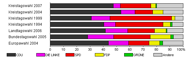 | Kreistagswahl 2007 | 41,2 | 47,5 | 5,2 | 23,0 | 3,8 | 0,6 | 19,8 | |