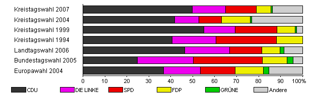 | Kreistagswahl 2007 | 32,6 | 49,9 | 15,0 | 14,0 | 6,7 | 0,7 | 13,7 | |