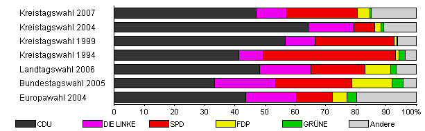 | Kreistagswahl 2004 | 54,7 | 64,2 | 15,3 | 6,9 | 2,0 | 1,0 | 10,6 | |