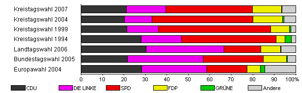 | Kreistagswahl 2007 | 34,8 | 21,2 | 18,3 | 40,4 | 13,5 | 0,3 | 6,3 | |