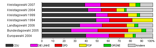 | Kreistagswahl 2007 | 34,0 | 38,8 | 14,2 | 25,8 | 5,9 | 3,8 | 11,6 | |