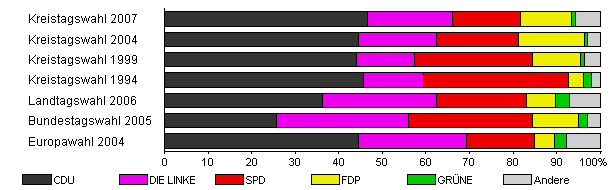| Kreistagswahl 2007 | 33,5 | 46,7 | 19,5 | 15,5 | 11,7 | 0,9 | 5,6 | |