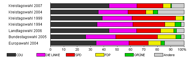 | Kreistagswahl 2007 | 29,4 | 43,8 | 21,0 | 19,5 | 5,7 | 0,7 | 9,3 | |