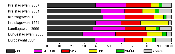 | Kreistagswahl 2007 | 28,2 | 39,0 | 24,7 | 19,8 | 6,8 | 2,1 | 7,6 | |