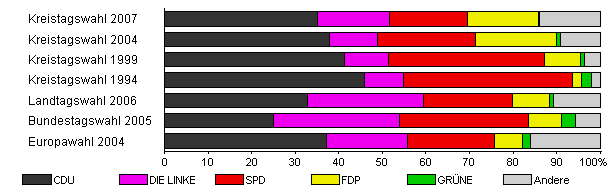 | Kreistagswahl 2007 | 25,6 | 35,2 | 16,4 | 17,9 | 16,3 | 0,2 | 13,9 | |