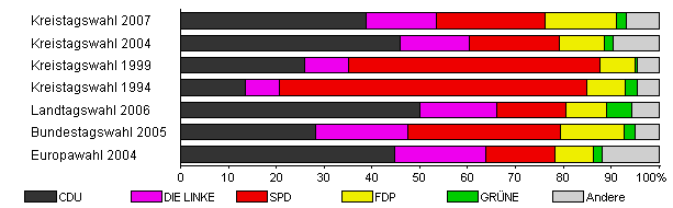 | Kreistagswahl 2007 | 27,4 | 38,9 | 14,5 | 22,9 | 14,9 | 2,0 | 6,8 | |