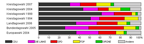 | Kreistagswahl 2007 | 49,0 | 30,5 | 10,2 | 15,5 | 14,3 | 2,9 | 26,5 | |