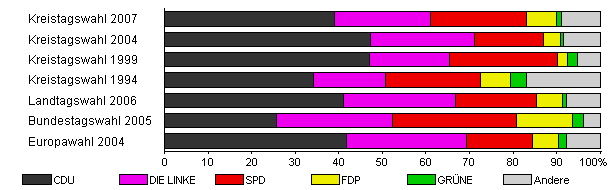 | Kreistagswahl 2007 | 31,9 | 39,1 | 21,9 | 22,0 | 6,9 | 1,2 | 9,0 | |