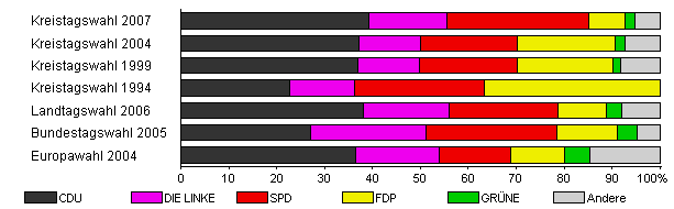 | Kreistagswahl 2007 | 33,1 | 39,3 | 16,3 | 29,6 | 7,6 | 1,9 | 5,4 | |