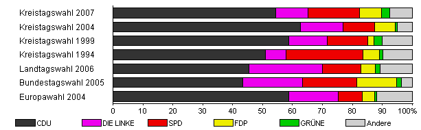 | Kreistagswahl 2007 | 34,5 | 54,4 | 10,7 | 17,3 | 7,4 | 2,6 | 7,7 | |
