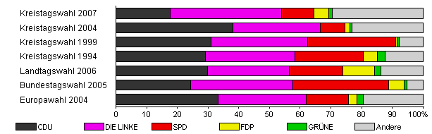 | Kreistagswahl 2007 | 41,7 | 17,6 | 36,3 | 10,6 | 4,9 | 1,1 | 29,5 | |