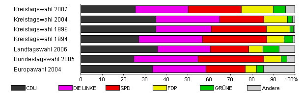 | Kreistagswahl 2007 | 34,2 | 25,5 | 24,7 | 24,9 | 14,9 | 5,8 | 4,1 | |