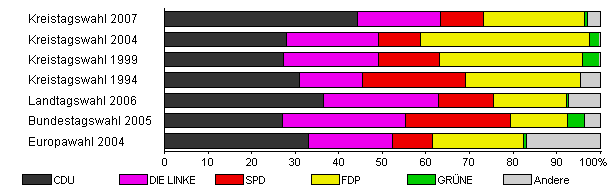 | Kreistagswahl 2007 | 37,2 | 44,2 | 19,1 | 9,9 | 23,1 | 0,8 | 3,0 | |