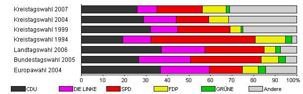 | Kreistagswahl 2007 | 36,0 | 26,0 | 9,1 | 21,2 | 11,0 | 1,6 | 31,2 | |