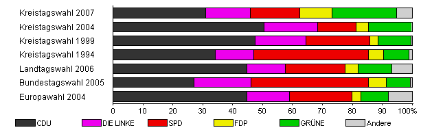 | Kreistagswahl 2007 | 59,1 | 31,0 | 14,8 | 16,7 | 10,8 | 21,5 | 5,2 | |