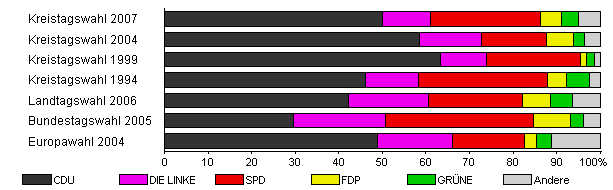 | Kreistagswahl 2004 | 46,1 | 58,6 | 14,1 | 15,0 | 6,3 | 2,5 | 3,6 | |