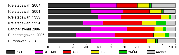 | Kreistagswahl 2004 | 39,7 | 34,0 | 25,0 | 20,9 | 9,4 | 1,3 | 9,4 | |