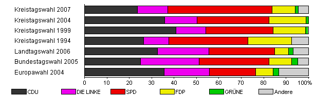 | Kreistagswahl 2007 | 44,8 | 23,6 | 13,7 | 46,4 | 10,5 | 1,3 | 4,6 | |