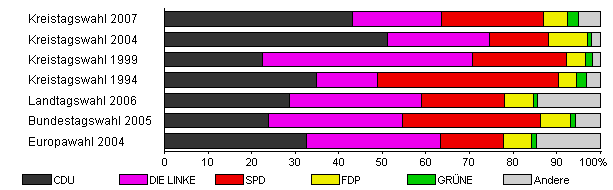 | Kreistagswahl 2004 | 40,3 | 51,2 | 23,3 | 13,7 | 9,0 | 0,9 | 1,9 | |
