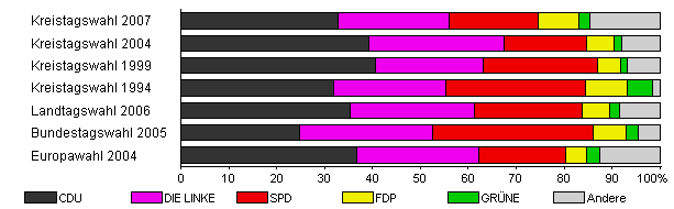 | Kreistagswahl 2007 | 33,5 | 32,8 | 23,2 | 18,7 | 8,4 | 2,4 | 14,5 | |