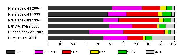 | Kreistagswahl 2004 | 66,8 | 50,8 | 23,6 | 14,4 | 5,0 | 4,3 | 1,9 | |