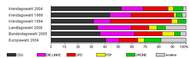 | Kreistagswahl 2004 | 49,6 | 52,2 | 15,9 | 18,6 | 4,0 | 7,0 | 2,3 | |