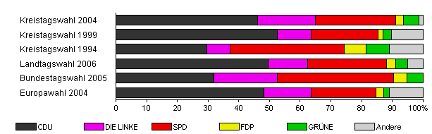 | Kreistagswahl 2004 | 71,6 | 46,2 | 18,7 | 26,3 | 2,5 | 5,1 | 1,1 | |