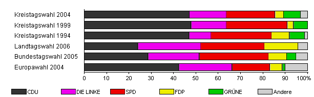 | Kreistagswahl 2004 | 72,5 | 47,1 | 16,4 | 21,8 | 4,0 | 7,6 | 3,1 | |