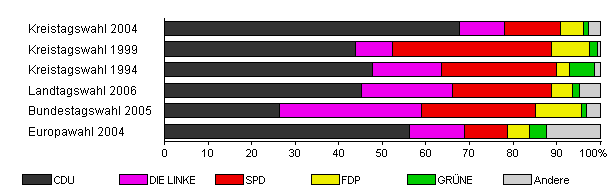 | Kreistagswahl 2004 | 73,2 | 67,8 | 10,2 | 12,9 | 5,3 | 1,1 | 2,7 | |